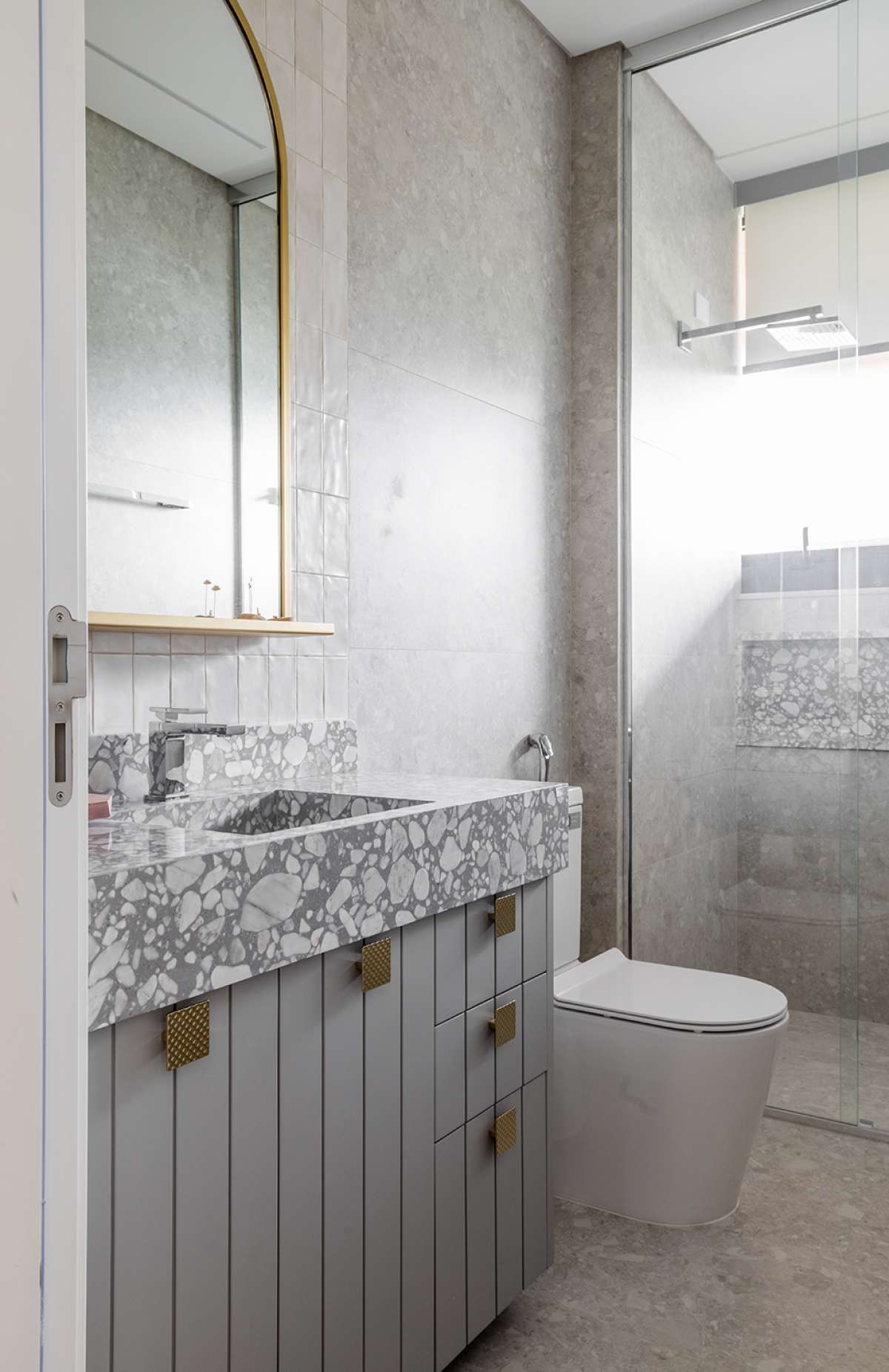 A escolha de materiais naturais e brutos foi proposital, com o objetivo de passar a sensação de aconchego e rusticidade. No entanto, na cozinha, foi utilizado um revestimento de inox nos armários para dar um toque de modernidade e leveza ao ambiente.